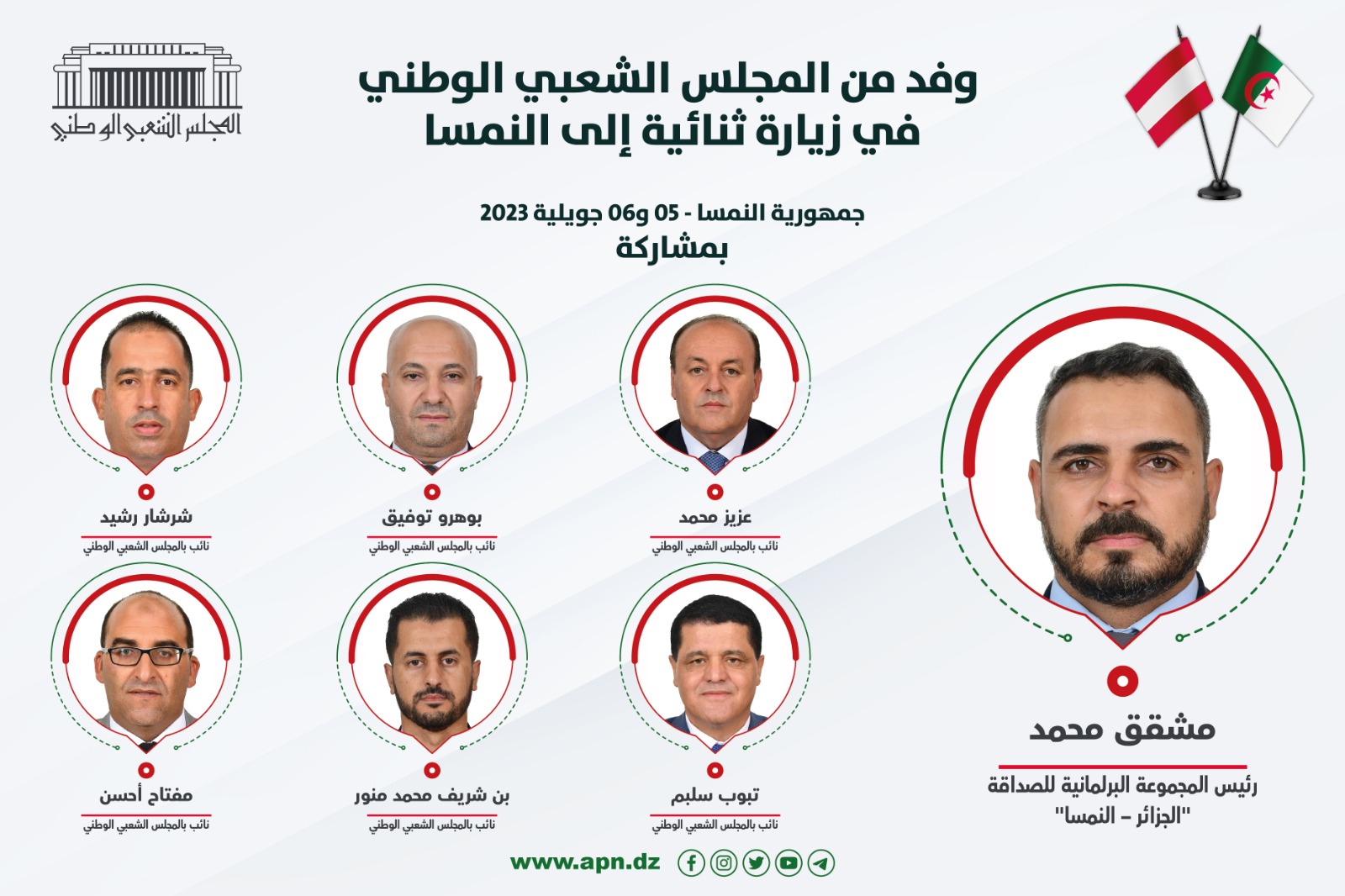 للإشارة، فإن وفد المجلس الشعبي الوطني يتألف من السادة رئيس المجموعة البرلمانية للصداقة “الجزائر – النمسا” قائد الوفد السيد محمد مشقق، إلى جانب كل من محمد عزيز، توفيق بوهرو، رشيد شارشار، سليم تبوب، محمد منور بن الشريف واحسن مفتاح.
