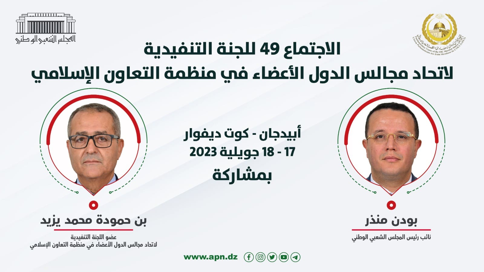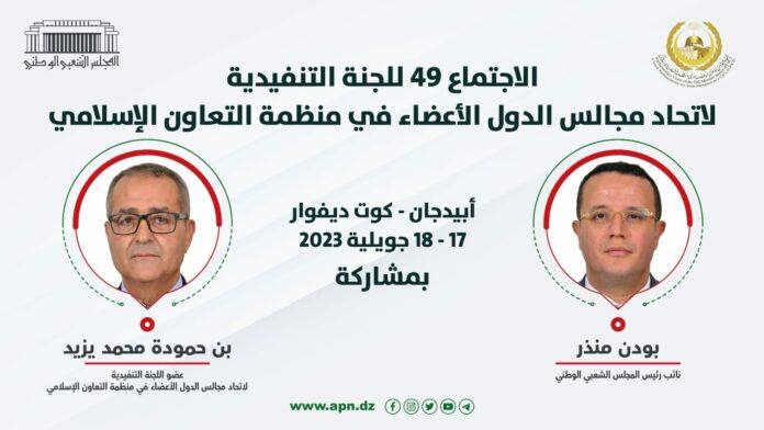 ممثلا للسيد إبراهيم بوغالي، رئيس المجلس الشعبي الوطني، يشارك نائب رئيس المجلس السيد منذر بودن، رفقة السيد محمد يزيد بن حمودة عضو اللجنة التنفيذية لاتحاد مجالس الدول الأعضاء في منظمة التعاون الإسلامي، في الاجتماع الـ 49 للجنة التنفيذية لاتحاد مجالس الدول الأعضاء في منظمة التعاون الإسلامي، المقرر عقدها بالعاصمة أبيدجان (كوت ديفوار) يومي 17 و18 من الشهر الجاري.