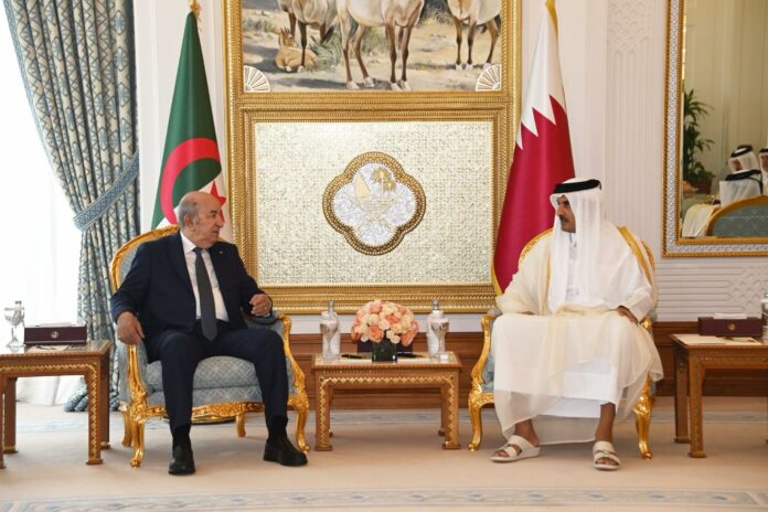 استقبل اليوم رئيس الجمهورية السيد عبد المجيد تبون من قبل أخيه صاحب السمو الشيخ تميم بن حمد آل ثاني أمير دولة قطر الشقيقة بالديوان الأميري بالدوحة .