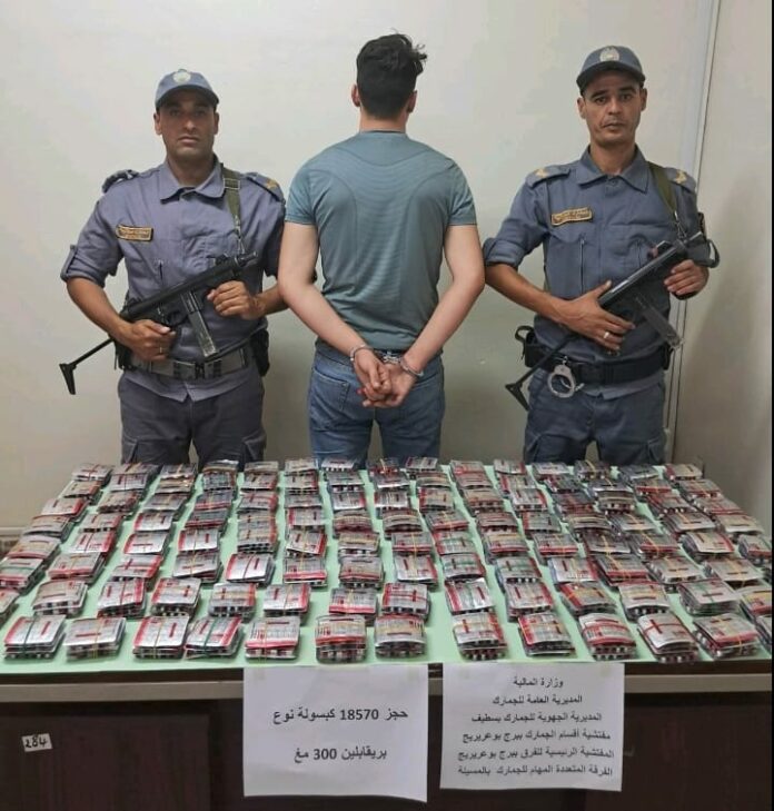 مواصلة للمجهودات الميدانية الحثيثة المبذولة من طرف الفرق العملياتية لمصالح الجمارك الجزائرية، والتي تندرج في إطار ممارسة المهمة الحمائية والأمنية الرامية لمكافحة التهريب والجريمة المنظمة العابرة للحدود بشتى أنواعها، تمكن أعوان الفرقة المتعددة المهام للجمارك بالمسيلة التابعة لمصالح مفتشية الأقسام للجمارك ببرج بوعريريج، من إحباط عملية تهريب نوعية لأدوية مصنفة ذات خصائص مؤثرة عقليا، تمثلت في 18570 قرصا مهلوسا من بريغابالين 300 ملغ، تم ضبطها على إثر عملية تفتيش دقيقة، مخبأة بتجاويف مركبة نفعية.