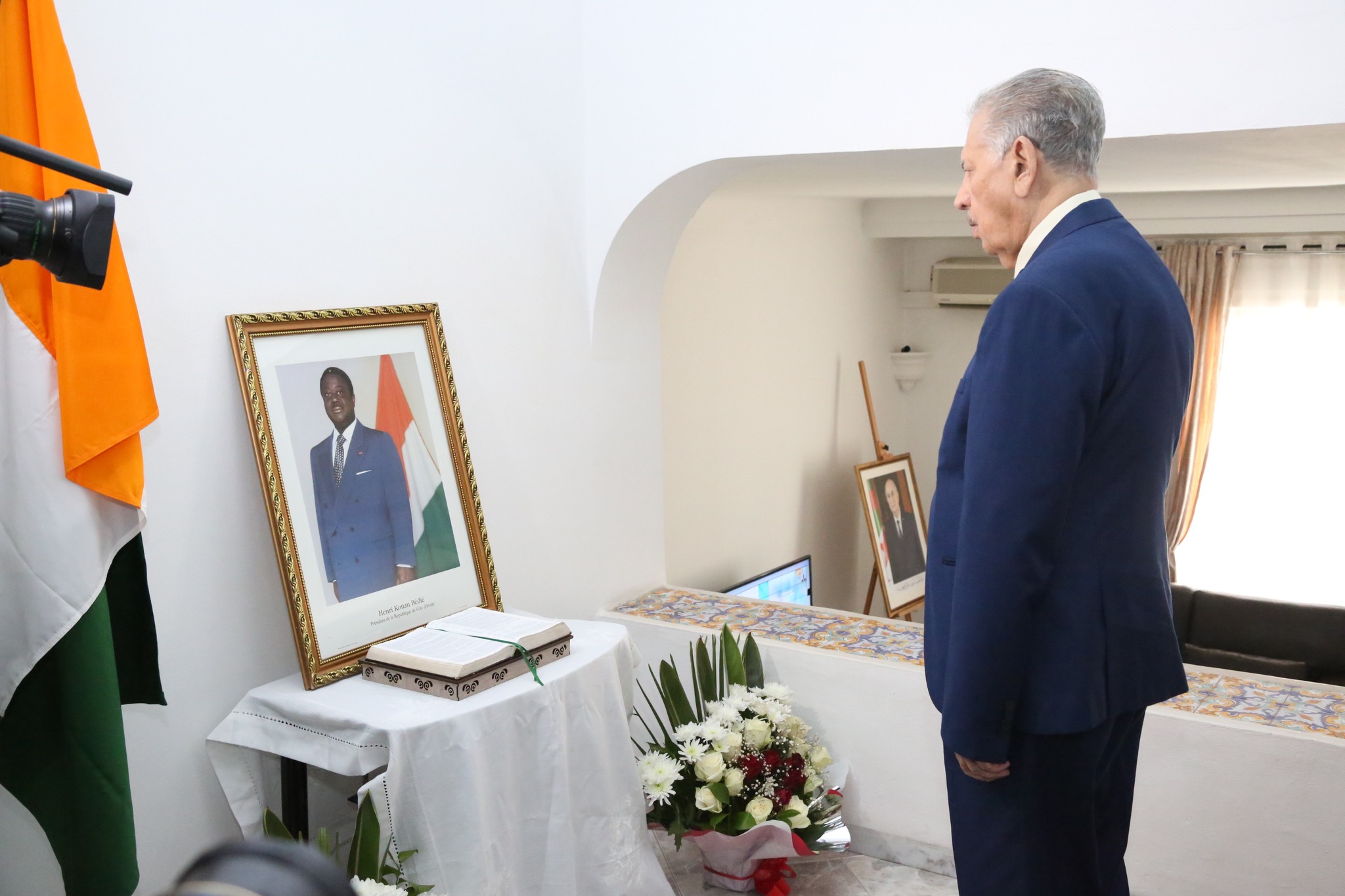 باسم رئيس الجمهورية، السيد عبد المجيد تبون، السيد صالح ڨوجيل رئيس مجلس الأمة، يوقع بمقر سفارة جمهورية كوت ديفوار بالجزائر، على سجل التعازي إثر وفاة الرئيس الايفواري الأسبق السيد هنري كونان بيديه..