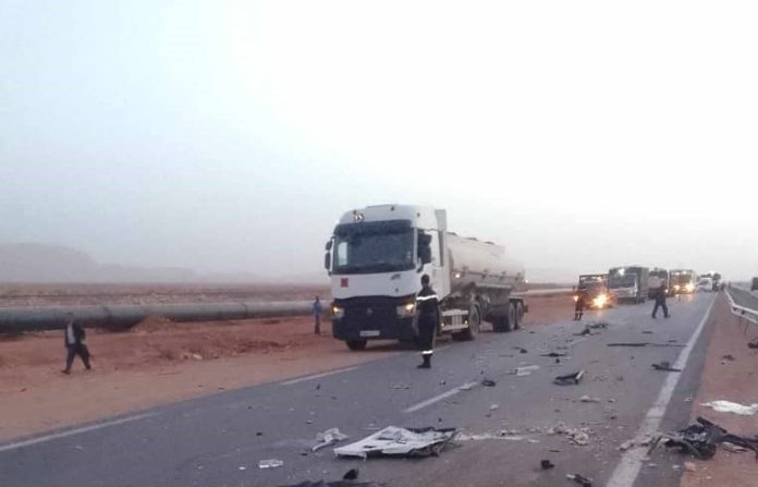 تدخلت مصالح الحماية المدنية على الساعة 06سا01د من أجل حادث إصطدام بين حافلة لنقل المسافرين و شاحنة ذات صهريج لنقل محروقات على مستوى الطريق الوطني رقم 06, بمنطقة المسماة زازفانة حوالي 35كلم إتجاه ولايةالنعامة، ببلدية و دائرة بني ونيف