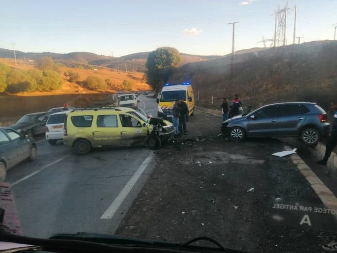 تدخلت مصالح الحماية المدنية على الساعة 07سا 32د من أجل حادث إصطدام بين سيارة أجرة و سيارة سياحية، بالطريق الوطني رقم 18 منطقة الزمالة ببلدية و دائرة البرواقية