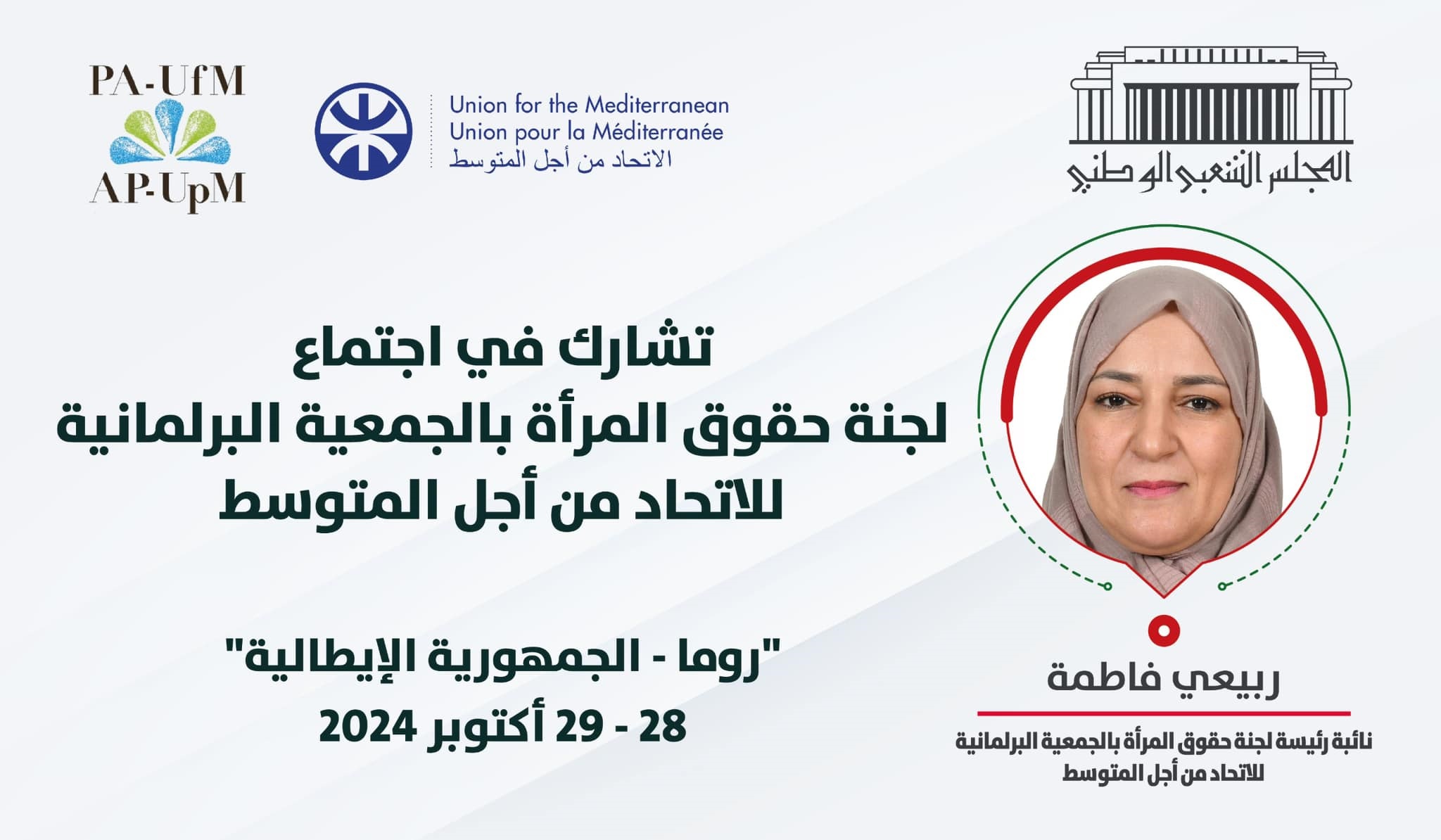 تشارك النائب فاطمة ربيعي، بصفتها نائبة رئيسة لجنة حقوق المرأة بالجمعية البرلمانية للاتحاد من أجل المتوسط في اجتماع ذات اللجنة، وذلك يومي 28 و 29 أكتوبر 2024 بروما (إيطاليا).