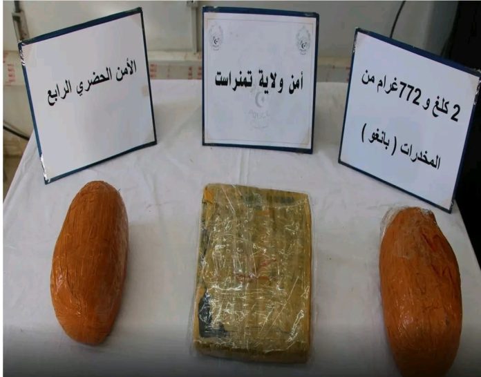 القضية الأولى : العملية تمت على إثر إستغلال مصالح الأمن الحضري الرابع لمعلومات مفادها وجود شخص يستغل مسكن بحي الشموع تمنراست في ترويج المخدرات ، التحريات التي قامت بها ذات المصالح مدعمة بإذن بالتفتيش الصادر عن السيد وكيل الجمهورية لدى محكمة تمنراست ، أفضت الى توقيف المشتبه فيه السالف الذكر وضبط كمية من الممنوعات قدر وزنها بـ 01 كلغ و900 غرام من مخدر البانغو ومبلغ مالي من عائدات الترويج .