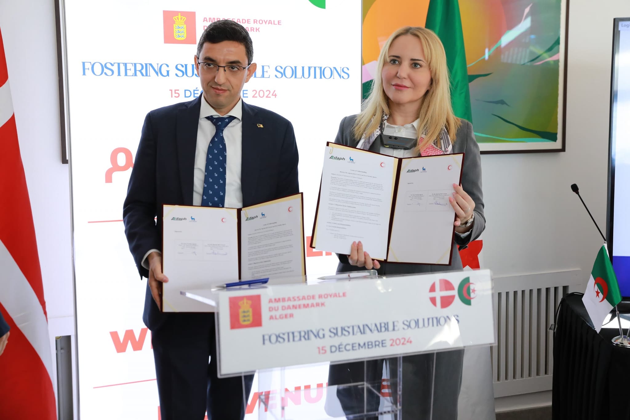 تم صبيحة اليوم توقيع اتفاقية بين الهلال الاحمر الجزائري ممثلا برئيسته د.حملاوي إبتسام و السيد المدير العام لشركة Novo nordisk السيد حمزة بن حرثات بالسفارة الملكية الدنماركية بالجزائر