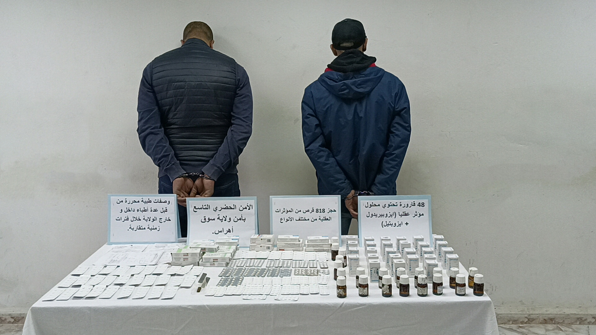 فرقة الشرطة القضائية بالأمن الحضري التاسع تتمكن من خلال عملية نوعية بتوقيف نشاط شبكة إجرامية تتاجر بالمؤثرات العقلية مع حجز كمية قدرت بـ 818 قرص من المؤثرات العقلية مختلفة الانواع بالإضافة إلى 48 قارورة لسائل ذو تأثير عقلي وكمية من المخدرات (قنب هندي) ووصفات طبية صورية
