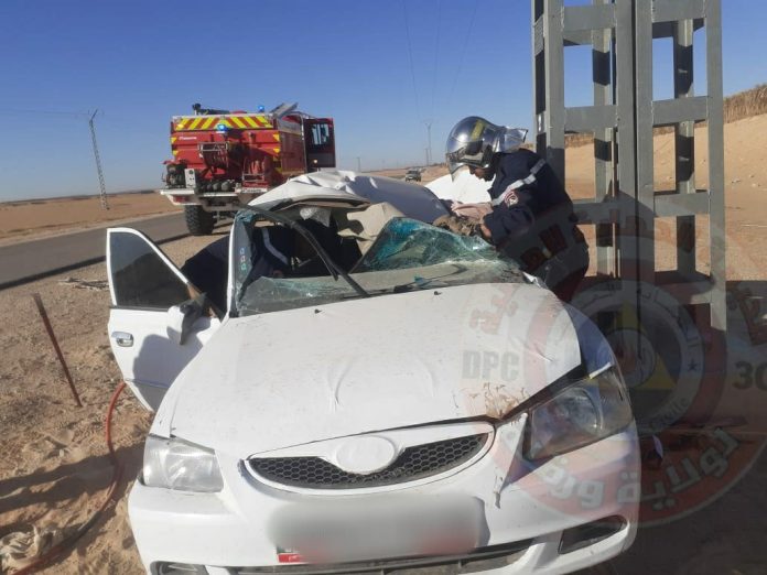 تدخلت مصالح الحماية المدنية على الساعة 09سا 05د من أجل حادث انحراف سيارة و اصطدامها بعمود كهربائي، على مستوى الطريق البلدي رقم 120 منطقة الخليج بلدية حاسي بن عبد الله ودائرة سيدي خويلد