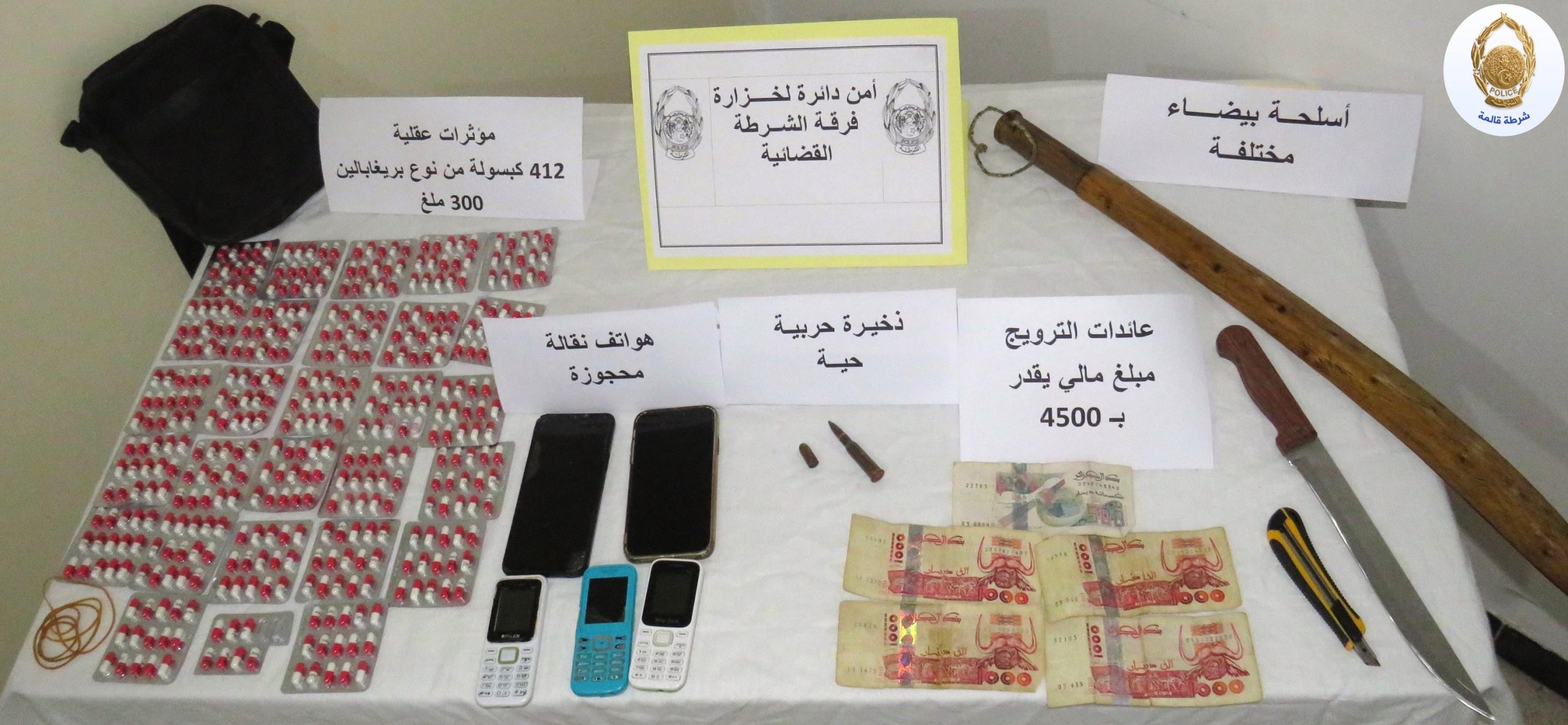 بعد اتخاذ كافة الإجراءات القانونية اللازمة بشأنهم ، تم ضبط وحجز : 412 كبسولة من المؤثرات العقلية ، أسلحة بيضاء مختلفة و ذخيرة حربية حية من الصنفين الرابع و الخامس.