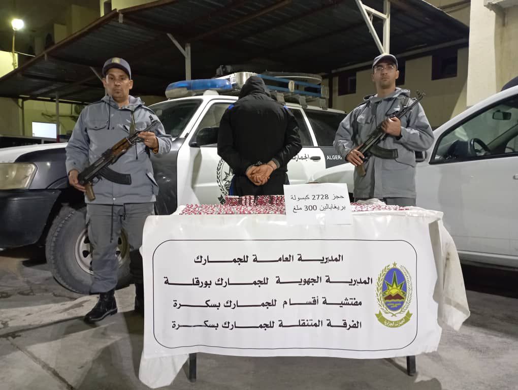 في سياق النشاط الميداني الحثيث والمتواصل للفرق الجمركية عبر إقليم اختصاص المديرية الجهوية للجمارك بورقلة، تمكن أعوان الفرقة المتنقلة للجمارك التابعة لمصالح مفتشية الأقسام للجمارك ببسكرة، من حجز 2728 كبسولة مهلوسة من نوع بريغابالين 300 ملغ، كما تم حجز سيارة سياحية استعملت في التهريب مع توقيف المخالفين وتقديمهم أمام الجهات القضائية المختصة.