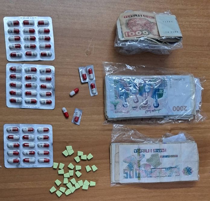 العملية مكنت من توقيف المشتبه فيهم و حجز 82 قرص مهلوس (بريقابالين + إكستازي)، سلاح أبيض محظور من الحجم الكبير (سيف)، مبلغ مالي من عائدات الترويج.