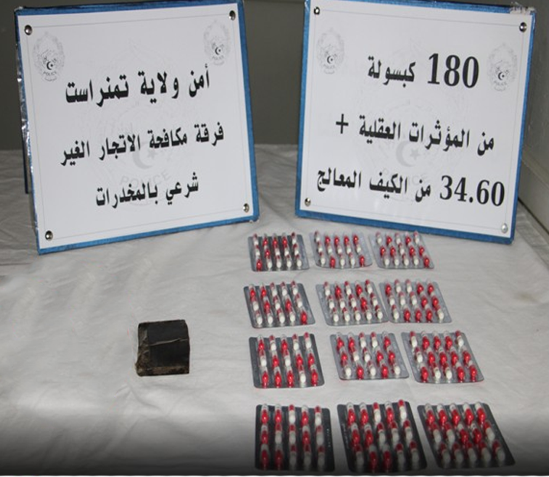 تمكنت فرقة مكافحة الاتجار الغير شرعي بالمخدرات بالمصلحة الولائية للشرطة القضائية بحر الاسبوع الجاري من توقيف شخصين و حجز كمية من المؤثرات العقلية قدرت بـ 180 قرص و 34.60 غرام من الكيف المعالج.