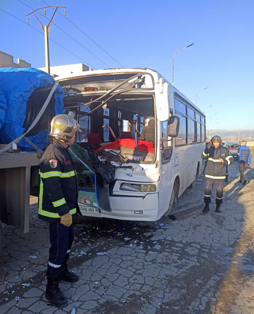 تدخلت فرق الحماية المدنية لوحدة العلمة صباح اليوم على الساعة 08:08 لحادث مرور تمثل في اصطدام حافلة لنقل العمال من الحجم المتوسط بمؤخرة شاحنة ذات مقطورة بالمنطقة الصناعية العلمة.