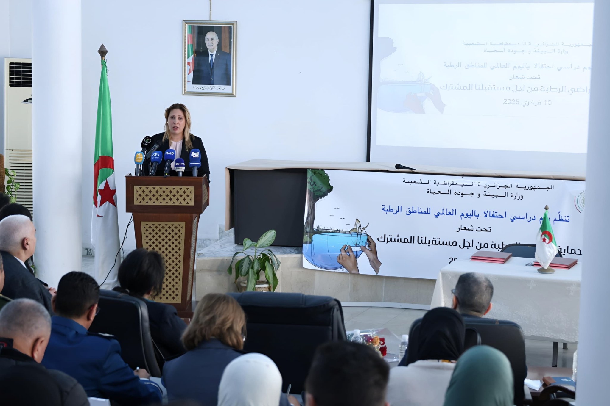 في اطار إحياء اليوم العالمي للمناطق الرطبة المصادف ل 02 فيفري من كل سنة ، والذي جاء هذه السنة تحت شعار “حماية الأراضي الرطبة من أجل مستقبلنا المشترك”، أشرفت وزيرة البيئة وجودة الحياة السيدة نجيبة جيلالي، صبيحة اليوم الإثنين 10 فيفري 2025، بمقر الوزارة، على إفتتاح فعاليات يوم دراسي وإعلامي حول المناطق الرطبة، وذلك بحضور كل من السيدات و السادة: مدير جامعة العلوم و التكنولوجيا هواري بومدين، المدير العام للديوان الوطني للتطهير، مديرة حديقة التجارب الحامة، ممثلي مختلف القطاعات، أعضاء لجنة المجالات المحمية، إطارات الوزارة، إطارات المؤسسات تحت الوصاية، ممثلي المجتمع المدني وأسرة الإعلام.