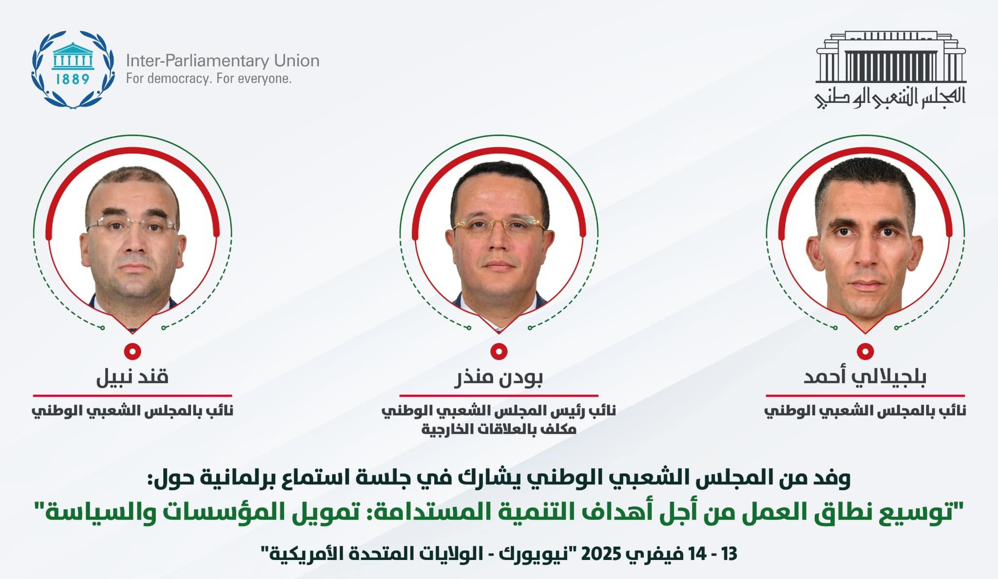 يتشكّل وفد المجلس من السيد منذر بودن، نائب رئيس المجلس الشعبي الوطني، إلى جانب النائبين بلجيلالي أحمد وقند نبيل.