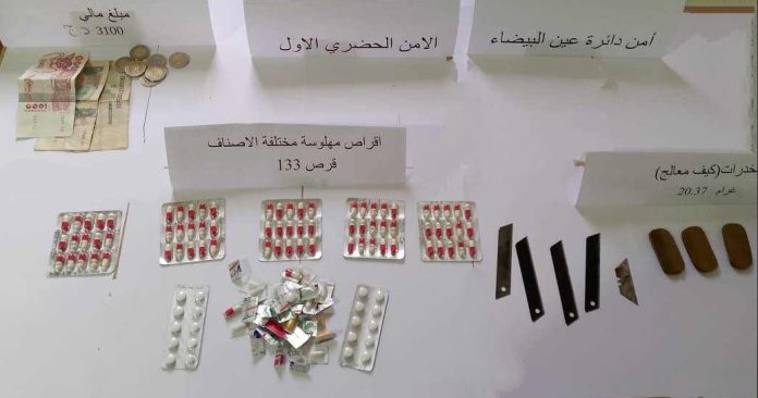 توقيف شخص يبلغ من العمر 21 سنة في قضية حيازة المخدرات والمؤثرات العقلية لغرض المتاجرة ويحجز 133 قرص مهلوس و 20.37 غرام من المخدرات (كيف معالج) و أسلحة بيضاء (كيتار) إضافة إلى مبالغ مالية من عائدات والترويـج.