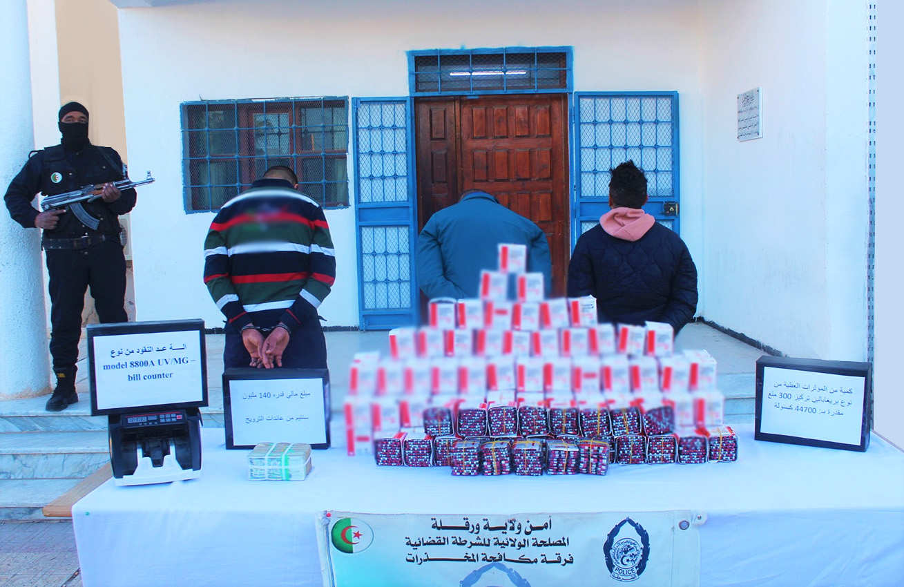 فرقة مكافحة الإتجار غير المشروع بالمخدرات بأمن ولاية ورقلة، توقف ثلاثة أشخاص وتحجز 44700 كبسولة من المؤثرات العقلية.