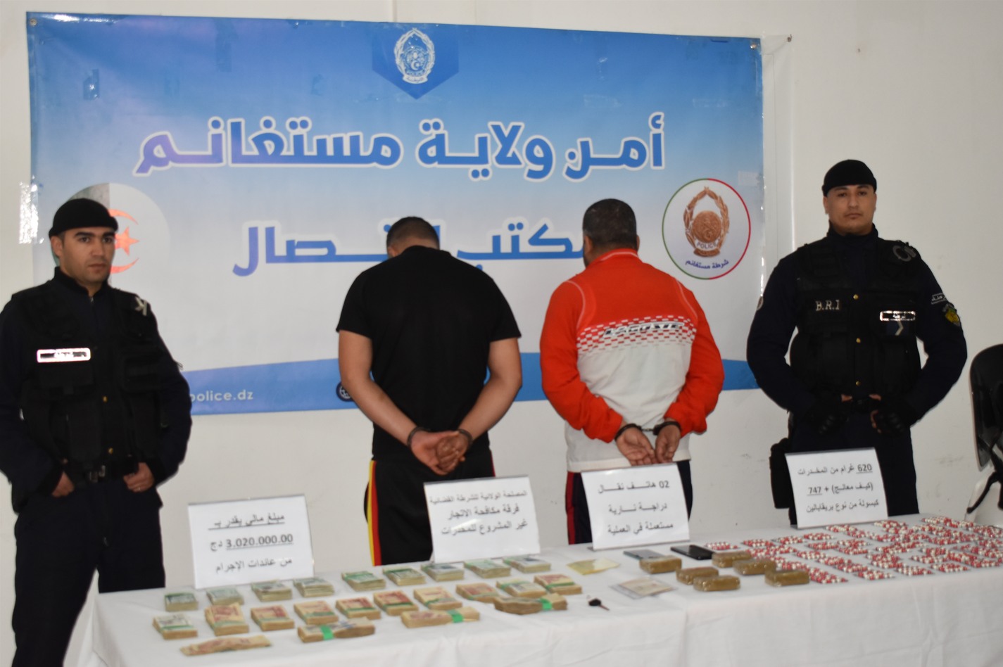 تمكنت فرقة مكافحة الإتجار غير المشروع للمخدرات التابعة للمصلحة الولائية للشرطة القضائية بأمن ولاية مستغانم من توقيف شخصين من ذوي السوابق القضائية، متورطان في قضية المتاجرة بالمخدرات والمؤثرات العقلية ضمن جماعة إجرامية منظمة. كما أسفرت العملية عن حجز 747 كبسولة مهلوسة نوع بريقابالين و06 صفائح من المخدرات بوزن 620 غرام، حجز مبلغ مالي يفوق 300 مليون سنتيم من عائدت الترويج واسترجاع الدراجة النارية المستعملة في عملية النقل والترويج مع حجز هاتفين نقالين.