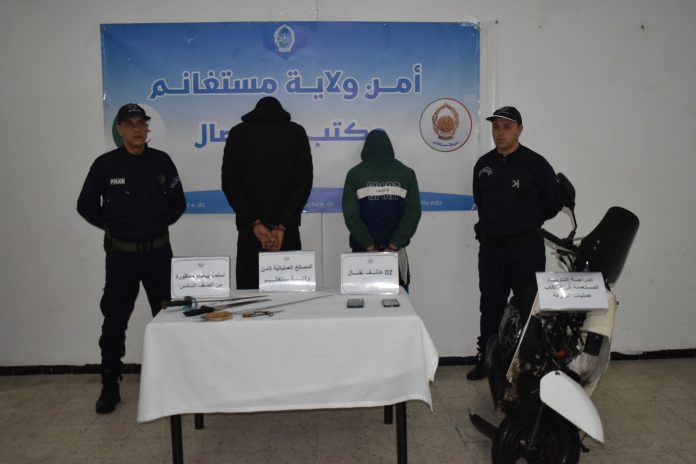 على إثر تداول مقطع فيديو عبر مواقع التواصل الاجتماعي يظهر فيه قيام شخصين على متن دراجة نارية، بالفرار بعد قيامهما بسرقة هاتف نقال لأحد المواطنين المصالح العملياتية لأمن ولاية مستغانم تتمكن من توقيف المشتبه فيهما الذين يحترفان سرقة الهواتف النقالة بالخطف في الطريق العام باستعمال دراجة نارية ، متورطين في 13 قضية سرقة مع حجز أسلحة بيضاء محظورة من الصنف السادس و الدراجة النارية المستعملة في عملية ارتكاب السرقات.
