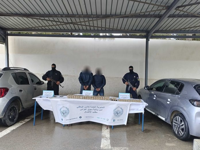 تمكن قوات الشرطة القضائية بالأمن الحضري الأول بأمن سوق أهراس من توقيف شخصين ينشاط ضمن شبكة إجرامية منظمة عابرة للحدود ، تنشط في مجال الإتجار بالمخدرات مع حجز 145 صفيحة من القنب الهندي بإجمالي 14.288 كلغ.