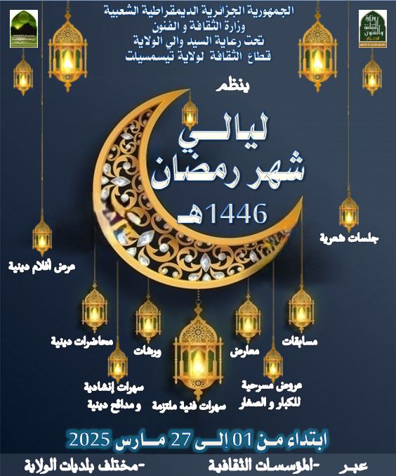 أعدت مديرية الثقافة لولاية تيسمسيلت برنامجا ثقافيا وترفيهيا لإحياء الليالي الرمضانية حسبما علم لدى ذات الهيئة.وحسب تصريح مير الثقافة ، أن هذا البرنامج تم إعداده بناء على طلبات فرق فنية وجمعيات ومثقفين أبدوا رغبتهم في تنشيط السهرات الرمضانية عبر البلديات ال22 للولاية. وتشمل فعاليات هذه السهرات العديد من الأنشطة الثقافية والفنية التي تواكب هذه المناسبة الدينية حيث ستقام حفلات في الإنشاد الديني وفي طابعي الشعبي والأندلسي وعروض مسرحية وأخرى فكاهية ومعارض للفنون التشكيلية . وذكر ذات المصدر أنه تم أيضا تكييف هذا البرنامج الرمضاني مع مختلف المناسبات المتعلقة بشهر مارس على غرار عيد المرأة و يوم النصر والعطلة المدرسية الربيعية واليوم العالمي لذوي الاحتياجات الخاصة حيث برمجت جلسات أدبية نسوية وعروض مسرحية وترفيهية للأطفال وسهرة فنية ذات طابع وطني. وستقام هذه الأنشطة عبر المرافق الثقافية ودور الشباب والمكتبات بالبلديات وكذا الساحات العمومية والمراكز البيداغوجية لذوي الاحتياجات الخاصة وفق ما أشير إليه.