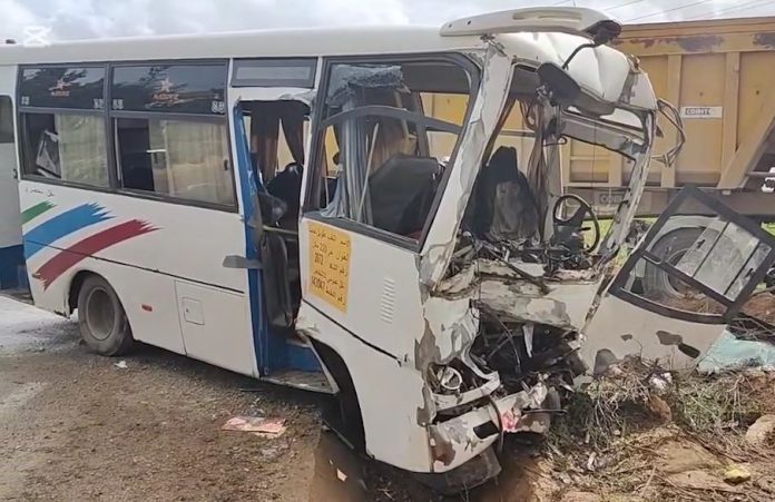 تدخلت مصالح الحماية المدنية على الساعة 12سا30د من أجل حادث إصطدام بين شاحنة ذات مقطورة و حافلة، بالطريق الولائي رقم 02 منطقة مخرف ، بلدية و دائرة فرندة