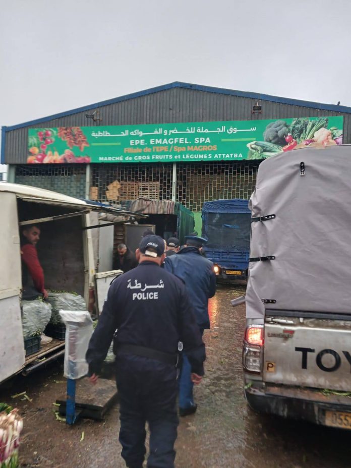 استمرارا لمهامها في مراقبة تسويق الخضر والفواكه خلال شهر رمضان، باشرت صبيحة أمس شرطة تيبازة ممثلة في عناصر كل من المصلحة الولائية للشرطة العامة و الأمن الحضري الخارجي الحطاطبة عملية مراقبة وتفتيش مشتركة بالتنسيق مع مصالح الرقابة الاقتصادية وقمع الغش لمديرية التجارة بتيبازة على مستوى سوق الجملة للخضر و الفواكه بالحطاطبة خصوصا المواد التي تشهد ارتفاع كبير في السعر غير المبرر أين تم حجز أكثر من 26 قنطار من مادة الموز، بسبب مخالفة عدم القيد في السجل التجاري قيد رئيسي و عدم الفوترة.