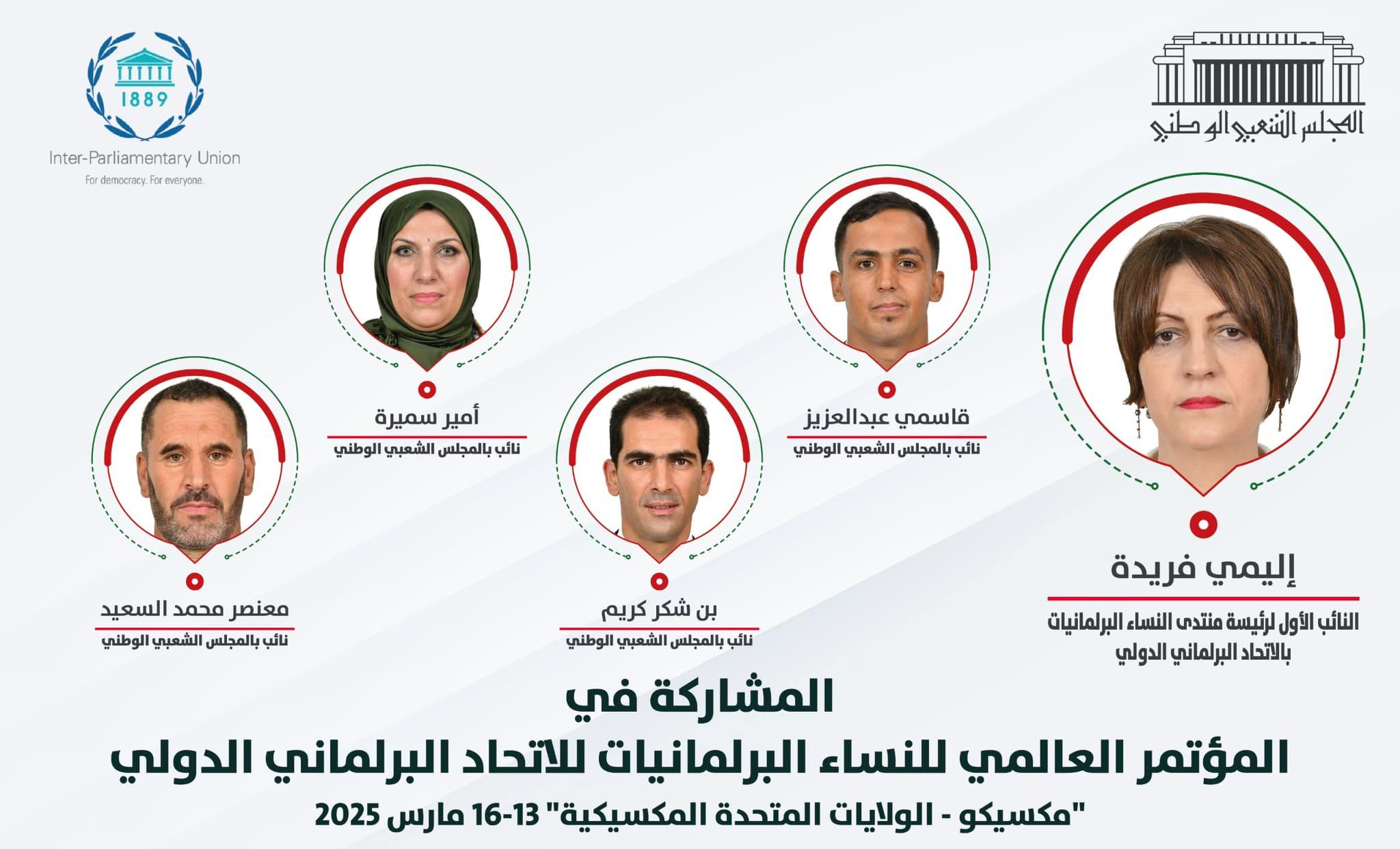 يشارك وفد عن المجلس الشعبي الوطني في أشغال المؤتمر العالمي للنساء البرلمانيات للاتحاد البرلماني الدولي، والذي سينعقد من 13 إلى 16 مارس 2025، بالعاصمة المكسيكية مكسيكو.