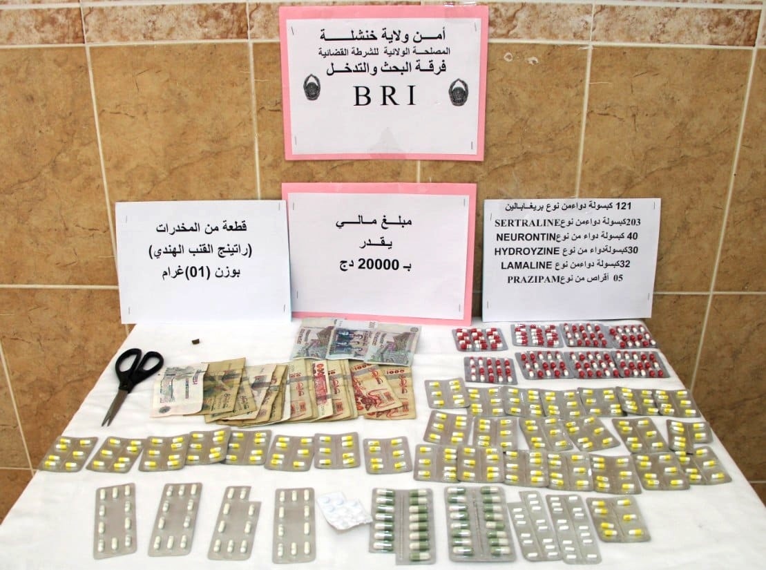 قام عناصر فرقة البحث و التدخل بتوقيف شخص يبلغ من العمر 27 سنة و ذلك بناء على معلومات تفيد قيام السالف الذكر بترويج المؤثرات العقلية مستغلا في ذلك مسكنه العائلي بحي 17 أكتوبر بمدينة خنشلة ليتم استصدار إذن بتفتيشه وحجز 431 كبسولة من المؤثرات العقلية بمختلف الأنواع، 01 غرام مخدرات بالاضافة إلى مبلغ مالي يقدر بـ 20.000 دج من عائدات الترويج و بعد استكمال كافة الاجراءات القانونية اللازمة تم تقديم المشتبه به أمام النيابة المحلية.