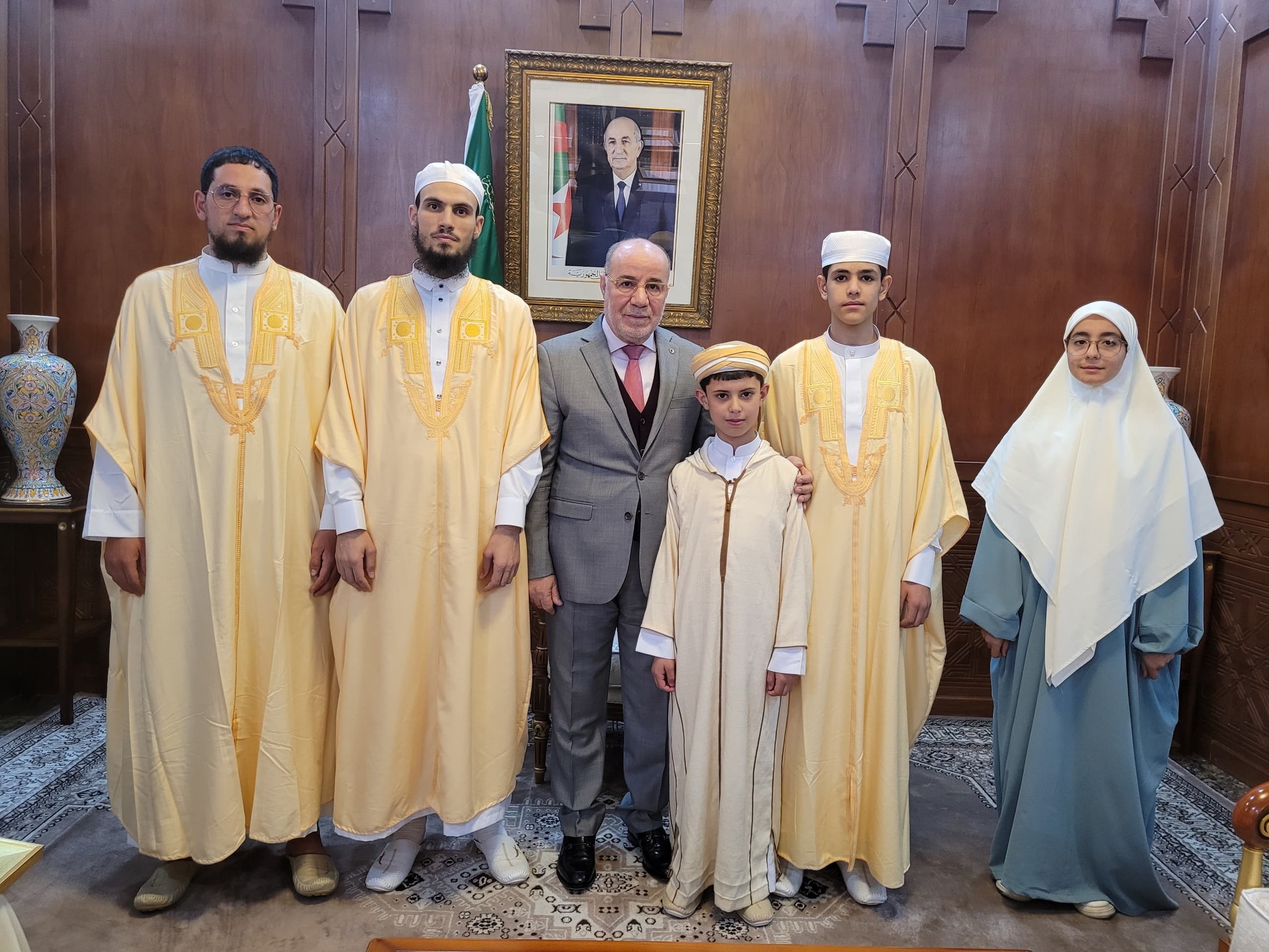 استقبل السيد وزير الشؤون الدينية والأوقاف الدكتور يوسف بلمهدي صباح اليوم 27 مارس 2025 بمقر الوزارة، المتسابقين المتوجين بالمراتب الثلاثة الأولى للمسابقة الوطنية لحفظ القرآن الكريم وتجويده وتفسيره في طبعتها الخامسة، والمسابقة التشجيعية لصغار الحفظة في طبعتها الواحد والعشرين واللتين تم تنظيمهما من طرف وزارة الشؤون الدينية والأوقاف برعاية سامية من رئيس الجمهورية السيد عبد المجيد تبون، في الفترة الممتدة من 22 إلى 26 مارس الجاري، وتم تكريمهم من طرف الوزير الأول السيد نذير العرباوي في الحفل الرسمي الذي أقيم بجامع الجزائر بمناسبة ليلة القدر المباركة، وقد حضر اللقاء أعضاء لجنة تحكيم المسابقة التي جرت فعالياتها في إطار جائزة الجزائر لحفظ القرآن الكريم ولإحياء التراث الإسلامي.
