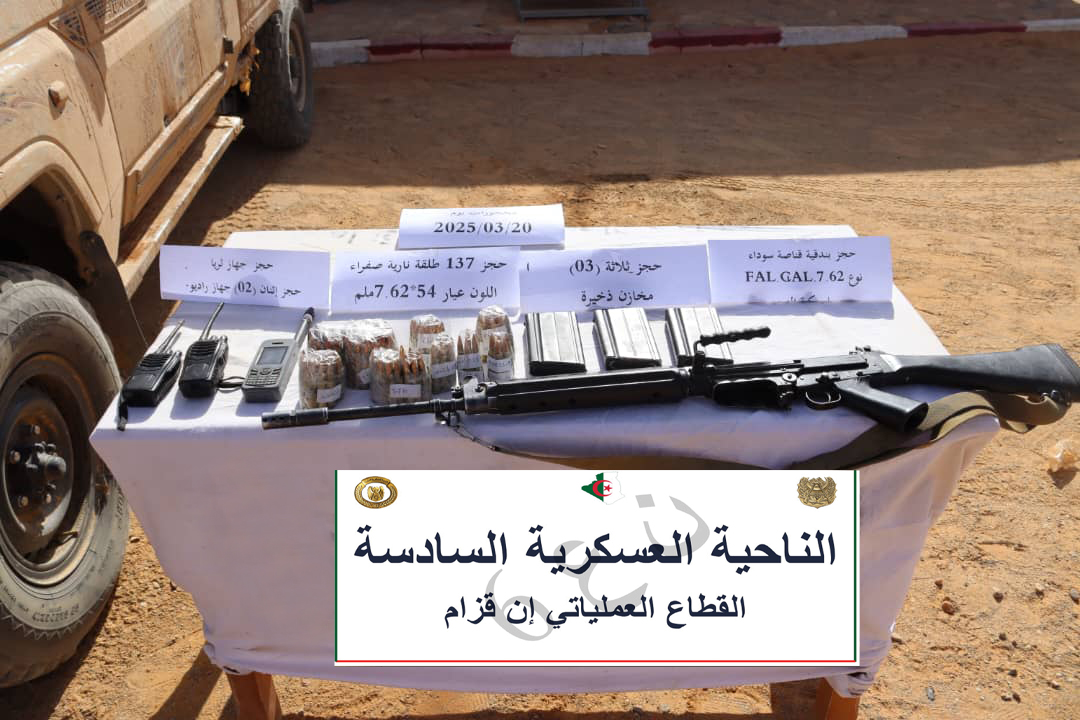 -تمكنت مفارز للجيش الوطني الشعبي، يوم 21 مارس 2025، من القضاء على إرهابيين (2) إثنين، بإن قزام بالناحية العسكرية السادسة، واسترجاع بندقية (1) قناصة وكمية معتبرة من الذخيرة وأغراض مختلفة.