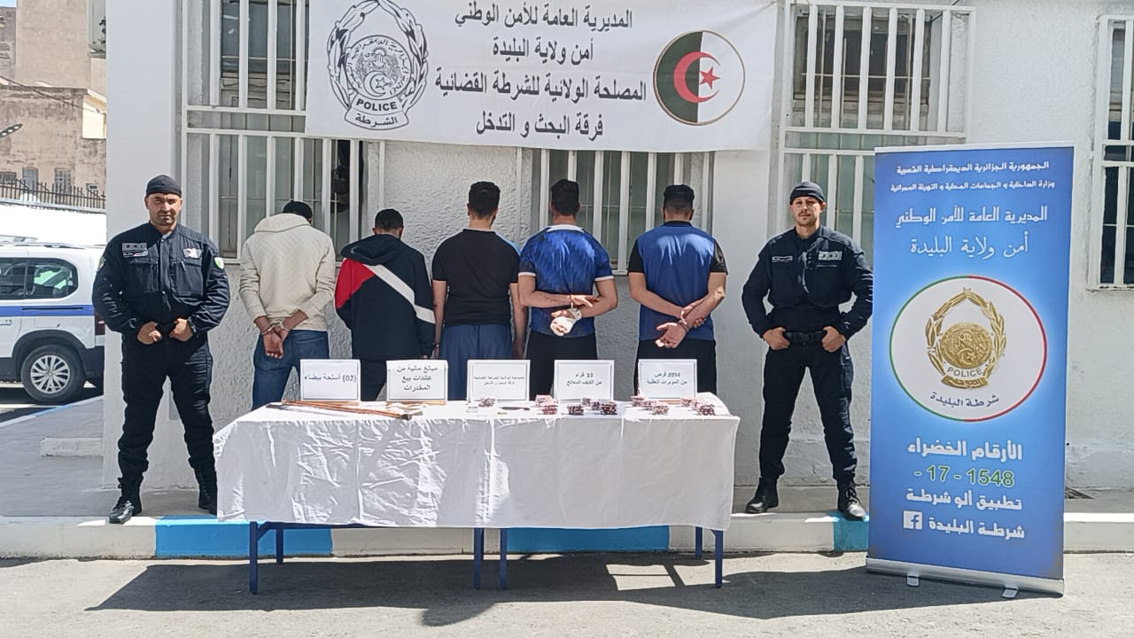 حيث تمكنت فرقة البحث و التدخل بالمصلحة الولائية للشرطة القضائية بأمن ولاية البليدة في عملية نوعية من توقيف جماعة إجرامية منظمة تتكون من خمسة أشخاص تتراوح أعمارهم ما بين 24 سنة و 39 سنة، يقومون بنقل و تخزين المخدرات و المؤثرات العقلية من أجل ترويجها و هذا بعد ورود معلومات تفيد عن تحركاتهم المشبوهة و بعد التنسيق مع النيابة المختصة إقليميا و إستصدار أذون بتفتيش مساكن المشتبه فيهم تم ضبط: