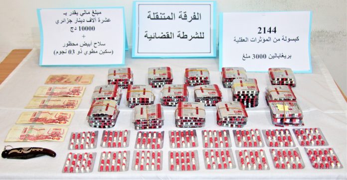 المشتبه فيه ، في الثلاثينات من العمر، تم توقيفه من قبل عناصر الفرقة المتنقلة للشرطة القضائية بجامعة، عندما كان على متن حافلة لنقل المسافرين، قادمة من إحدى الولايات الجنوبية متوجهة إلى الولايات الشمالية، بعد تفتيش الحقيبة التي كانت بحوزته تم ضبط كمية معتبرة من المؤثرات العقلية قدرت بـ : 2144 كبسولة من نوع بريغابالين 300 ملغ ، كما ضبط بحوزته سلاح أبيض محظور دون مبرر شرعي