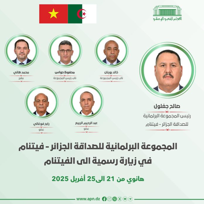 يقوم وفد من المجموعة البرلمانية للصداقة “الجزائر-فيتنام” بزيارة رسمية إلى هانوي خلال الفترة من 20 إلى 25 أفريل 2025، بهدف تعزيز التعاون البرلماني والعلاقات الثنائية بين البلدين. يترأس الوفد السيد صالح جغلول ويضم عددًا من النواب من مختلف الأحزاب السياسية الجزائرية.