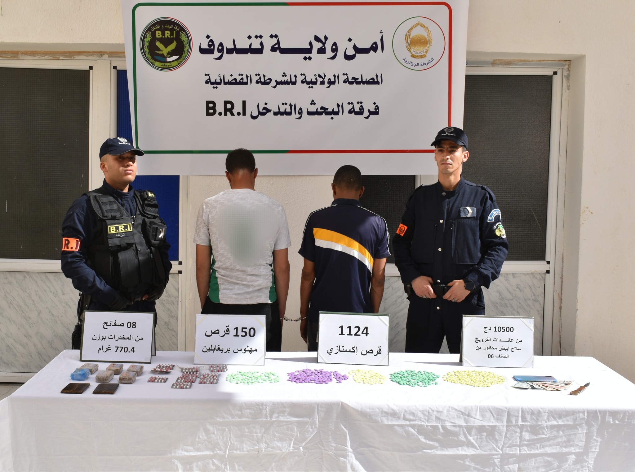 العمليتين أسفرت عن حجز 1124 قرص مهلوس إكستازي ، 150 كبسولة بريقابالين 300 ملغ ، 08 صفائح من المخدرات (كيف معالج ) بوزن 770,4 غرام ، مبلغ مالي 10500 دج ، سلاح أبيض محظور من الصنف السادس . بعد إستفاء الإجراءات القانونية تم تقديم المشتبه فيهما أمام النيابة المحلية .