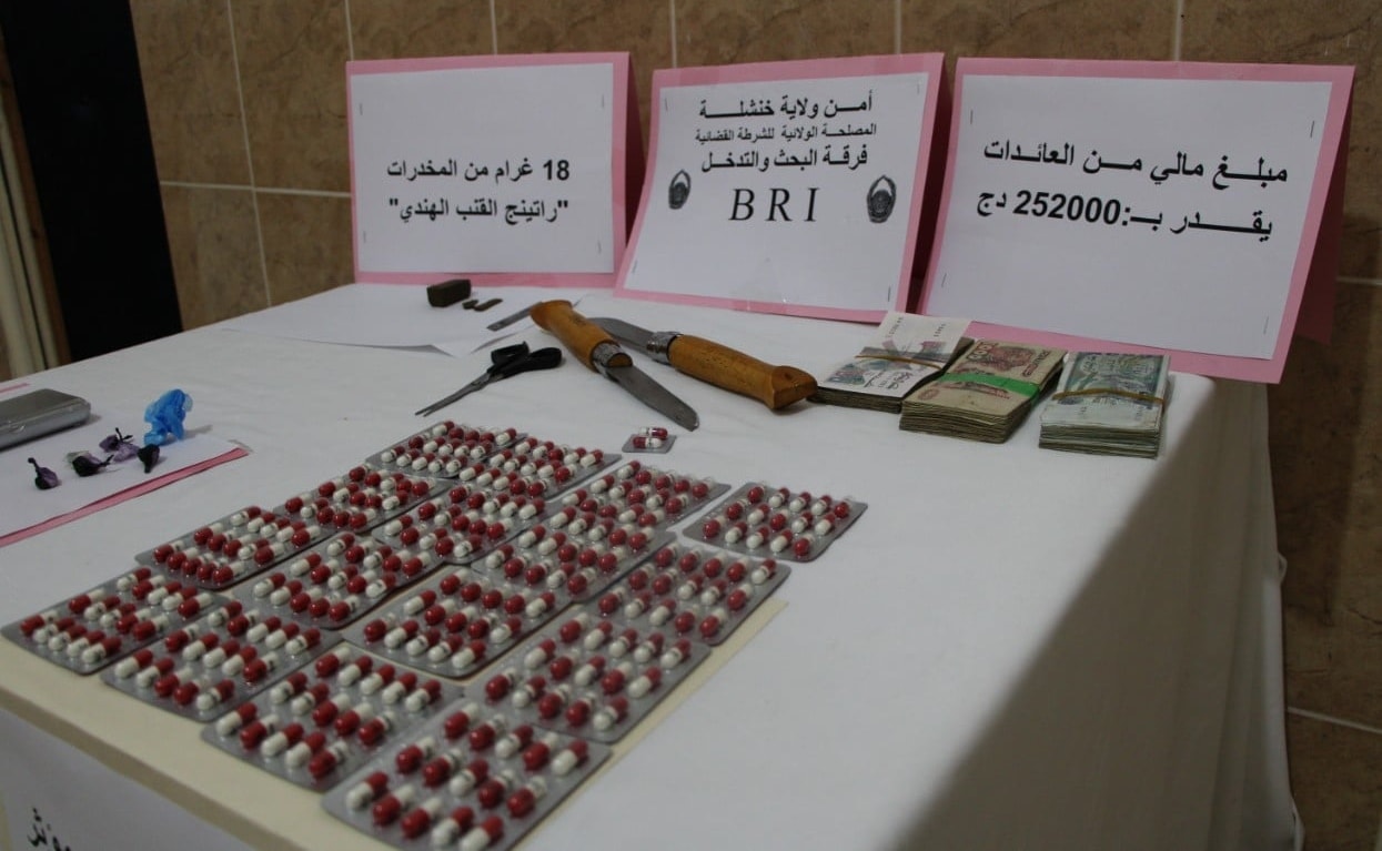 بناء على معلومات تحصل عليها عناصر فرقة البحث و التدخل مكنتهم من توقيف شخص يبلغ من العمر 33 سنة مسبوق قضائيا يستغل مسكنه العائلي بحي لحسن مرير بخنشلة لترويج المخدرات والمؤثرات العقلية مع بيع المشروبات الكحولية وبعد استصدار إذن بالتفتيش تم حجز مايلي: 2.50 غرام كوكايين، 242 كبسولة بريغابلين 300 ملغ، 18 غرام مخدرات، 108 وحدة من المشروبات الكحولية مختلفة الأنواع، سلاحين أبيضين، ميزان إلكتروني بالاضافة إلى مبلغ 252000 دج من عائدات الترويج ليتم إنجاز ملف جزائي ضد المشتبه به و تقديمه أمام النيابة المحلية.