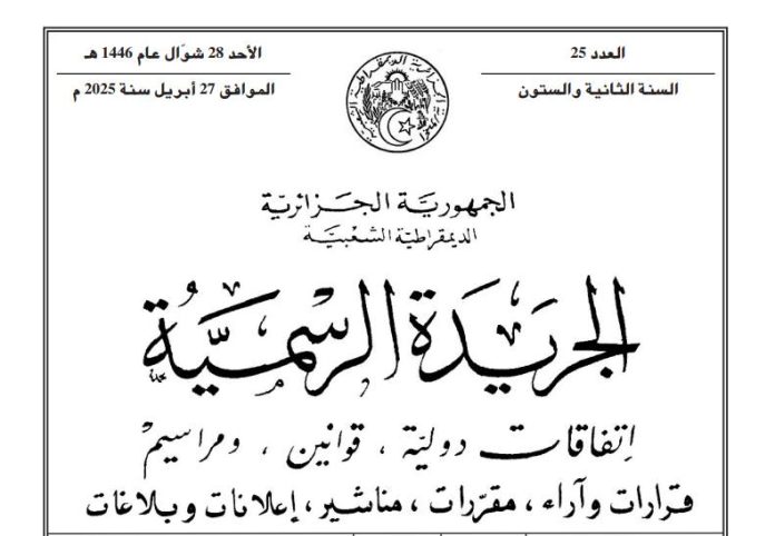وقد أُقر هذا المرسوم الرئاسي بتاريخ 23 شوال عام 1446، الموافق لـ22 أبريل سنة 2025، تحت توقيع رئيس الجمهورية عبد المجيد تبون، ونُشر رسميًا لتدخل أحكامه حيز التنفيذ.