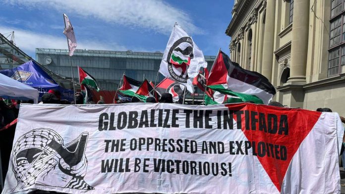 ورفع المشاركون في التظاهرات الأعلام الفلسطينية واللافتات المنددة بالجرائم التي يرتكبها الاحتلال الصهيوني بحق الشعب الفلسطيني, داعيين إلى ضرورة محاكمة الاحتلال على مجازره بحق الشعب الفلسطيني, ونددوا بالإبادة الجماعية في قطاع غزة.
