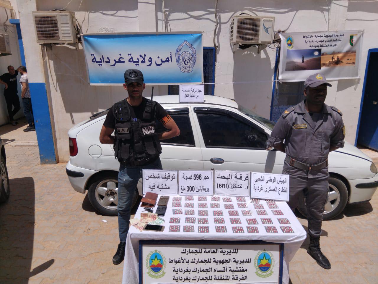 مواصلة للجهود الميدانية التي تبذلها الفرق العملياتية للجمارك، تمكنت الفرقة المتنقلة التابعة لمفتشية اقسام الجمارك بغرداية، بإقليم المديرية الجهوية للجمارك بالاغواط، بالتنسيق مع فرقة البحث والتدخل بالمصلحة الولائية للشرطة القضائية بغرداية والمصلحة الإقليمية للأمن الداخلي بغرداية، من حجز كمية من الاقراص المهلوسة تقدر بـ 596 قرص من نوع بريغبالين 300 ملغ على متن سيارة سياحية.