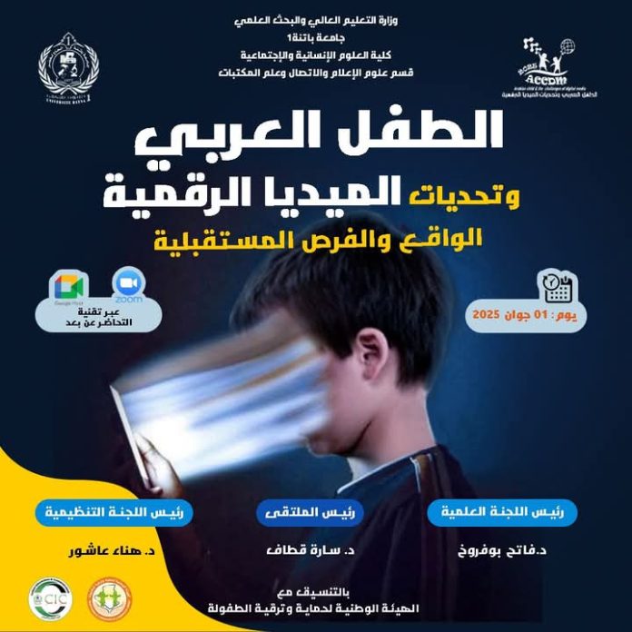 نظمت جامعة باتنة 1 البارحة ملتقى دولي افتراضي ،الموسوم بعنوان :”الطفل العربي وتحديات الميديا الرقمية” تحت اشراف عميد كلية العلوم الانسانية والاجتماعية البروفيسور أنس عرعار ، و رئيس قسم علوم الاعلام و الاتصال البروفيسور باديس لونيس.
