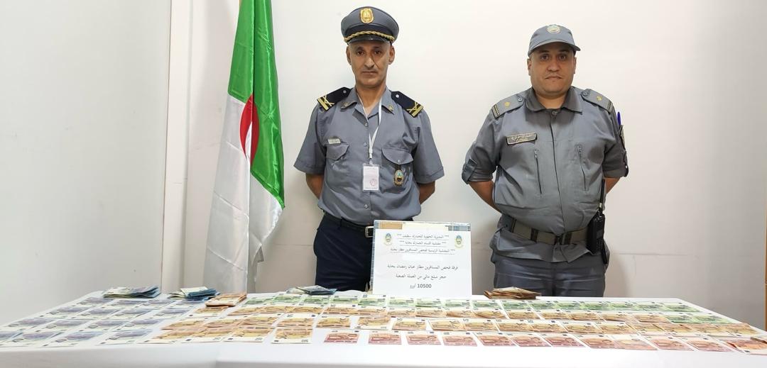 في إطار ممارسة مهام الرقابة الجمركية على الحركة الحدودية للمسافرين، عند الدخول والخروج من وإلى الإقليم الجمركي، تمكن أعوان المفتشية الرئيسية لفحص المسافرين على مستوى المطار الدولي”عبان رمضان” ببجاية، التابعة لمفتشية أقسام الجمارك ببجاية، إقليم اختصاص المديرية الجهوية للجمارك بسطيف، وتبعا لتصريح كاذب، من حجز مبلغ من العملة الأجنبية قدر بــ : 10.500 أورو، تم ضبطه بعد تفتيش جسدي وكذا تفتيش أمتعة مسافرة متجهة، عبر رحلة جوية، نحو مدينة باريس الفرنسية.