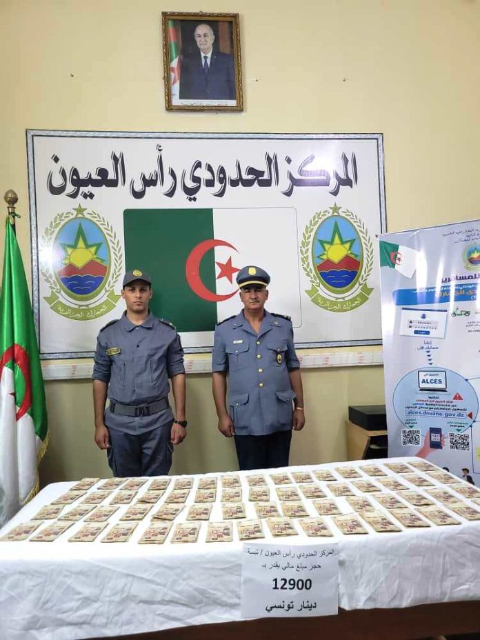 في إطار تنفيذ المهام الموكلة لمصالح الجمارك الجزائرية في مجال الرقابة على حركة المسافرين والتقيد بالتشريعات المتعلقة بالصرف، تمكنت مصالح فحص المسافرين بالمركز الحدودي رأس العيون، خلال عملية تفتيش اعتيادية، من ضبط مبلغ غير مصرح به من العملة الصعبة يقدر بـ12.900 دينار تونسي، كان بحوزة أحد المسافرين أثناء دخوله إلى التراب الوطني، في مخالفة صريحة للتنظيم المعمول به.