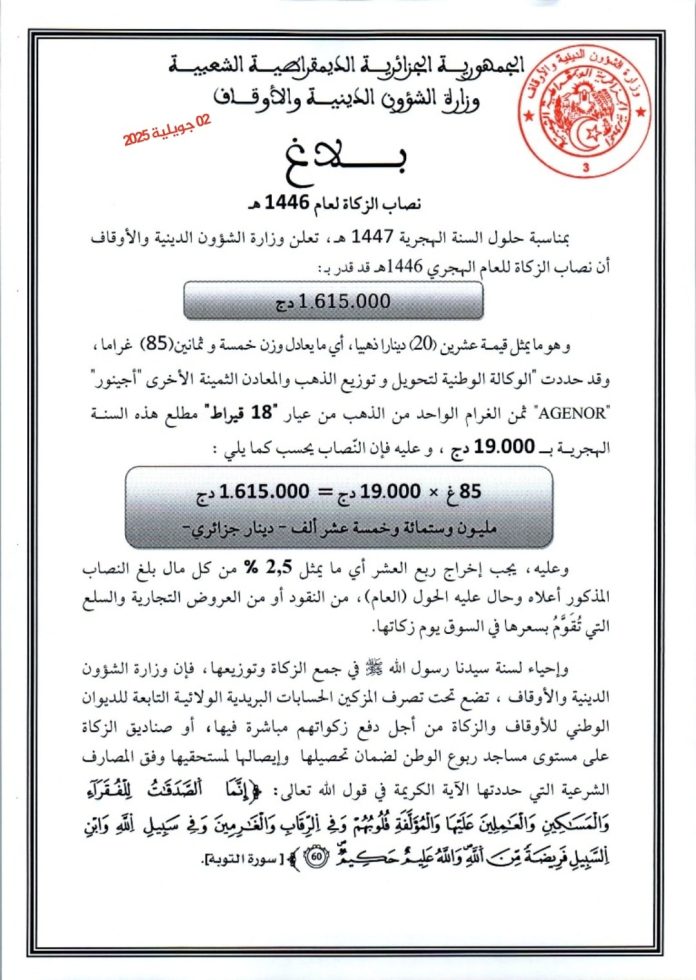 أعلنت وزارة الشؤون الدينية والأوقاف، في بيان لها اليوم الأربعاء، أن نصاب الزكاة للسنة الهجرية 1447 قد حُدّد بمبلغ 1.615.000 دينار جزائري، وهو ما يعادل قيمة 20 دينارًا ذهبياً أو ما يزن 85 غراماً من الذهب.