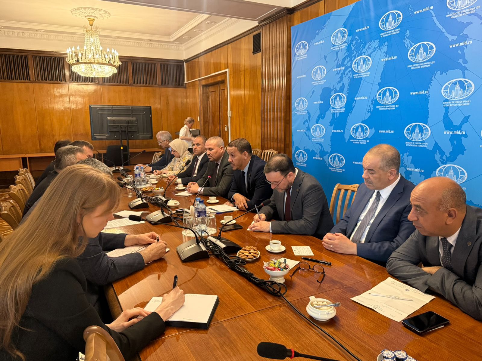 وفي هذا الإطار، عقد الوفد يوم 9 جويلية 2025 اجتماعًا بمقر وزارة الشؤون الخارجية الروسية، حيث التقى السيد ألكسندر كينشاك، رئيس دائرة الشرق الأوسط وشمال إفريقيا، بحضور السيد ديميتري صابلين، منسق مجموعة النواب مع برلمانات الشرق الأوسط وشمال إفريقيا.