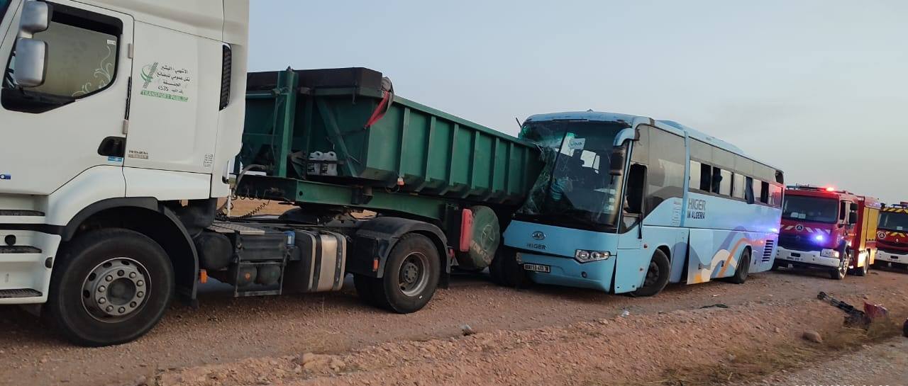 الحادث تمثل في اصطدام مباشر بين حافلة من نوع “هيقر” تحمل ترقيم ولاية جيجل وتعمل على خط جيجل – حاسي الرمل، وشاحنة من نوع “رونو” بمقطورة تحمل ترقيم ولاية الجلفة.