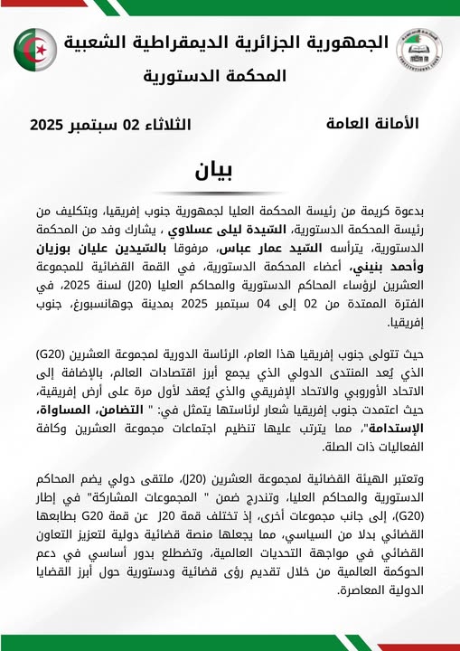 بدعوة كريمة من رئيسة المحكمة العليا لجمهورية جنوب إفريقيا، وتكليف من رئيسة المحكمة الدستورية، السيدة ليلى عسلاوي، يشارك وفد من المحكمة الدستورية، برئاسة السيد عمار عباس، مرفوقاً بالمستشارين عليان بوناب وأحمد شيبي، أعضاء المحكمة الدستورية، في أشغال القمة القضائية لمجموعة العشرين لرؤساء المحاكم الدستورية والمحاكم العليا (G20) لسنة 2025، في الفترة الممتدة من 02 إلى 04 سبتمبر 2025 بمدينة جوهانسبورغ، جنوب إفريقيا.