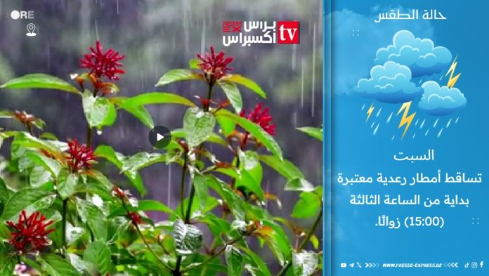 أعلنت مصالح الأرصاد الجوية عن تساقط أمطار رعدية معتبرة بداية من الساعة 15:00 زوالاً إلى غاية 21:00 مساءً، تمس عدة ولايات عبر الوطن.
