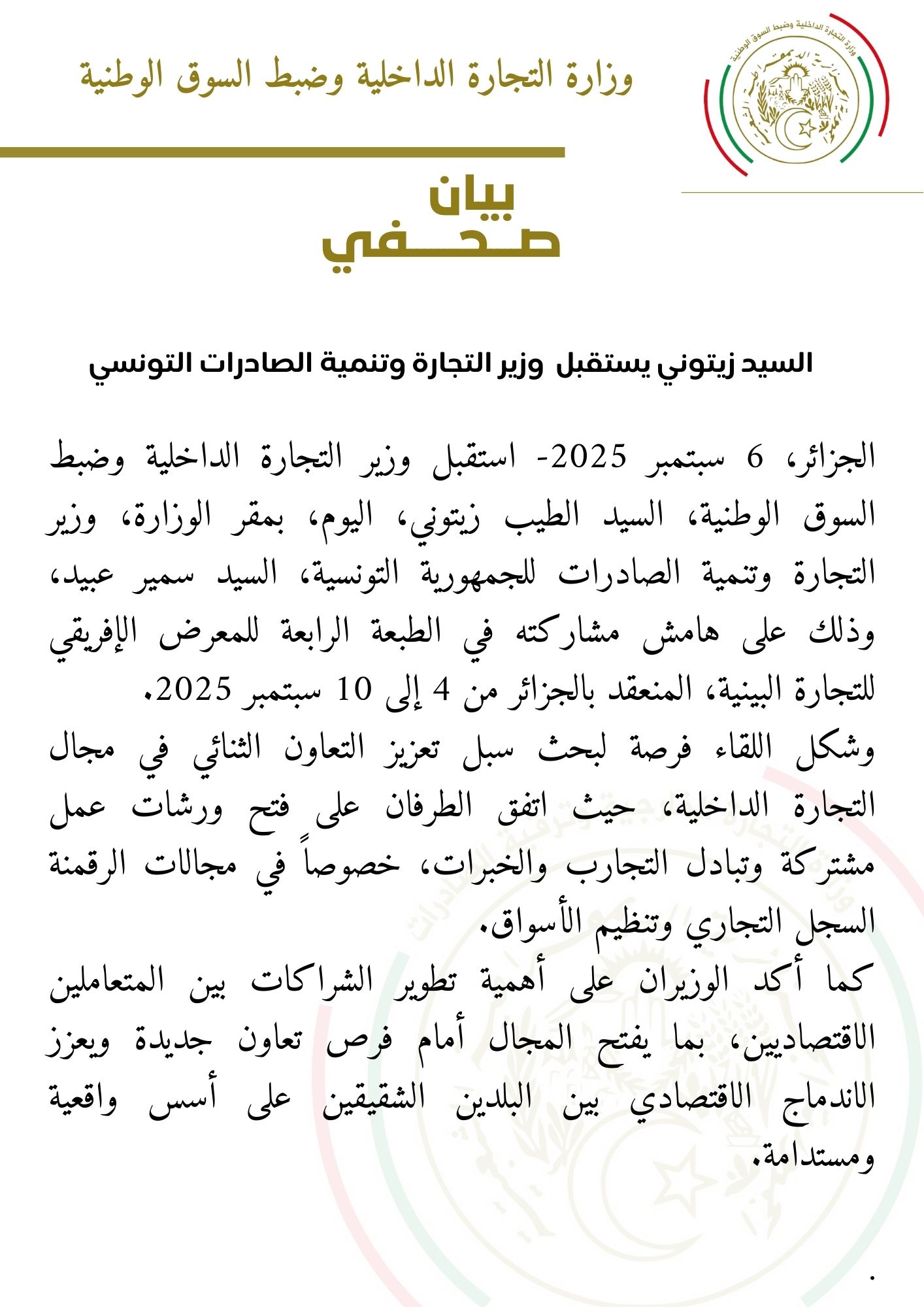 الجزائر، 6 سبتمبر 2025 – استقبل وزير التجارة الداخلية وضبط السوق الوطنية، السيد الطيب زيتوني، اليوم بمقر الوزارة، وزير التجارة وتنمية الصادرات للجمهورية التونسية، السيد سمير عبيد، وذلك على هامش مشاركته في فعاليات الطبعة الرابعة للمعرض الإفريقي للتجارة البينية، المنعقد بالجزائر من 4 إلى 10 سبتمبر الجاري.