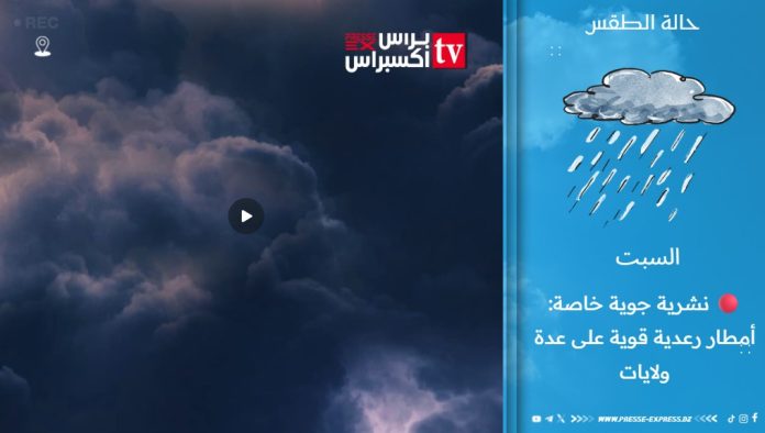 أصدر الديوان الوطني للأرصاد الجوية نشرية خاصة تحذّر من تساقط أمطار رعدية معتبرة قد تصل أو تفوق 15 ملم، وذلك ابتداءً من اليوم السبت 13 سبتمبر 2025 على الساعة 17:00 إلى غاية الأحد 14 سبتمبر 2025 على الساعة 02:00 صباحا.