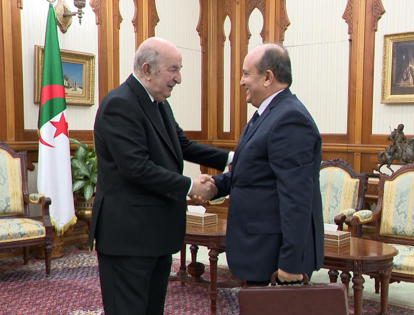 Homeالأخباررئيس الجمهورية يعيّن سيفي غريب وزيرًا أول ويكلفه بتشكيل الحكومة الأخبارالوطن رئيس الجمهورية يعيّن سيفي غريب وزيرًا أول ويكلفه بتشكيل الحكومة بقلم براس اكسبرس 14/09/2025 Share FacebookTwitterPinterestWhatsApp استقبل رئيس الجمهورية، السيد عبد المجيد تبون، اليوم، السيد سيفي غريب الوزير الأول بالنيابة، حيث رسّمه السيد الرئيس في منصب وزير أول، وكلّفه رسميًا بمباشرة مشاورات تشكيل الحكومة. Views: 253 LEAVE A REPLY Cancel reply Comment: Please enter your comment! Name:* Please enter your name here Email:* You have entered an incorrect email address! Please enter your email address here Website: Save my name, email, and website in this browser for the next time I comment. الاخبار الشائعة أولمبي الشلف يفسخ عقد المدرب بوعلي ويمنح بلعيد قيادة الفريق حتى نهاية الموسم 13/01/2026 شرطة ولاية الشلف توقف مروجي مخدرات وتسترجع أموالًا من عائدات النشاط الإجرامي 13/01/2026 لقاء وزاري جزائري مع سفراء السويد والمملكة المتحدة لتعزيز استثمارات الصناعة الصيدلانية 13/01/2026 وهران تستضيف النسخة الأولى للمعرض الوطني للمنتجات الجزائرية المصدرة لتعزيز الصادرات 13/01/2026